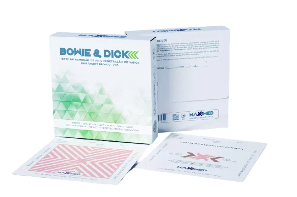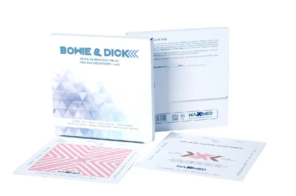 Teste Bowie & Dick tipo pacote pronto da Maxximed, tecnológico e inovador, é composto por exclusiva embalagem impermeável e um conjunto de folhas que formam um eficiente sistema de barreira. Com design super compacto e tecnologia pioneira, garante a eficiência, reprodutibilidade, qualidade, segurança e economia em seu processo.Disponível na versão remoção de ar e penetração de vapor (7 quilos) conforme ISO 11140 parte 4 e também na versão remoção de ar (4 quilos) conforme ISO 11140 parte 5.