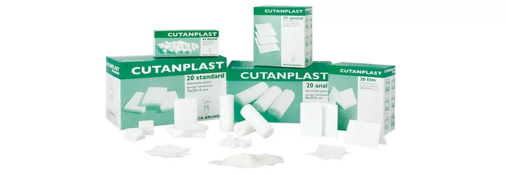 Cutanplast Standard Dim. 70 x 50 x 10 mmCutanplast Special Dim. 70 x 50 x 1 mmCutanplast Anal Dim. 80 x 30 ø mm Cutanplast Dental Dim. 10 x 10 x 10 mm Cutanplast FilmDim. 200 x 70 x 0,5 mmCutanplast DialDim. 30 x 30 x 10 mm Cutanplast Powder Dim. 1 g