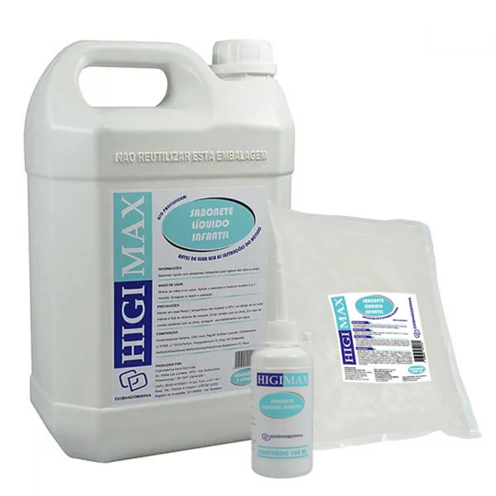 Higimax Sabonete Líquido Infantil loção cremosa infantil de caráter aniônico para corpo e cabelo, especialmente elaborado para a limpeza de crianças e bebês. Foi desenvolvido de acordo com as normas da ANVISA para uso pediátrico.